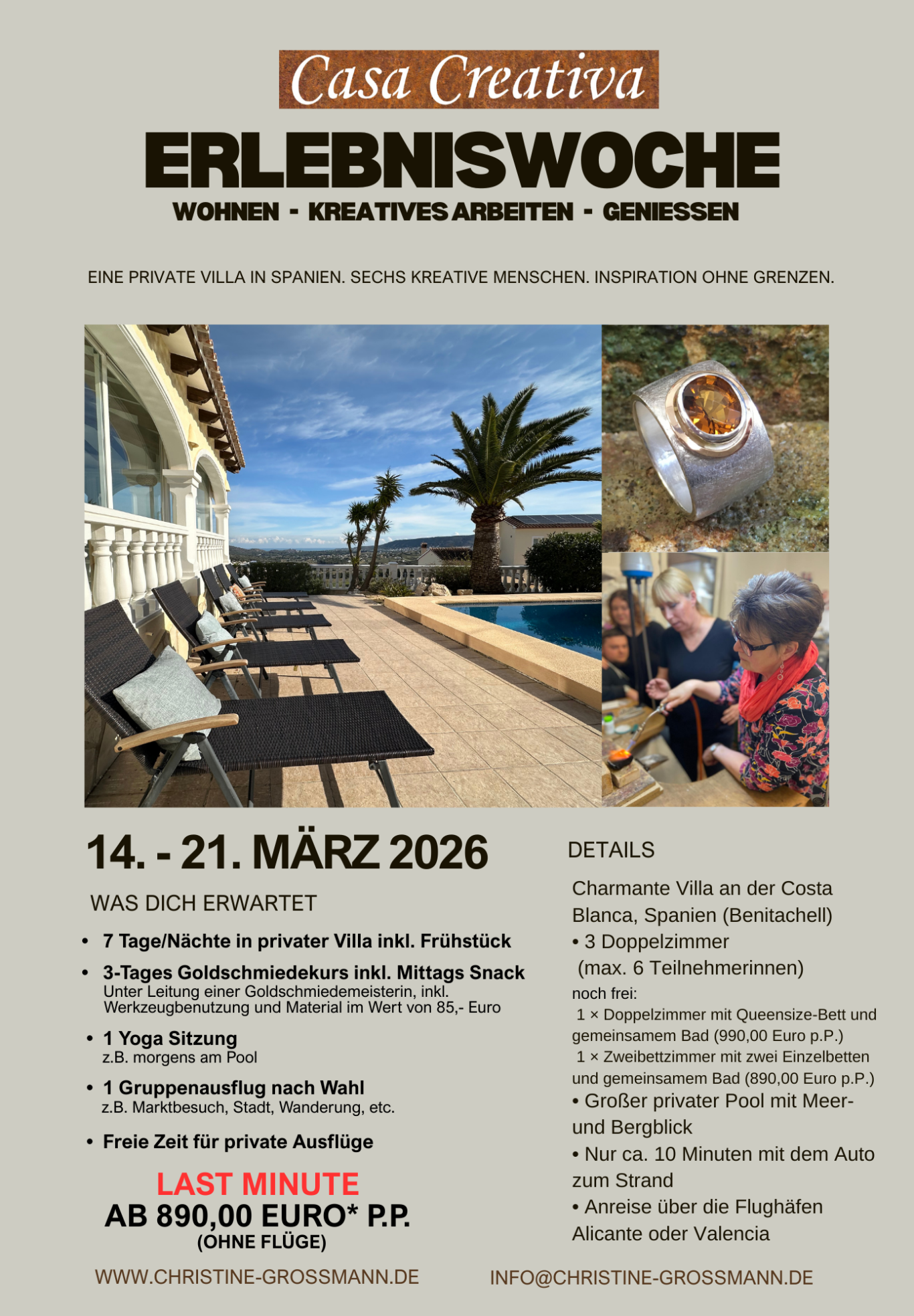 Für das Event: Wohnen in der Casa Creativa inkl. individuellen Goldschmiedekurs erstelle ich gerne einen unverbindlichen Kostenvoranschlag!